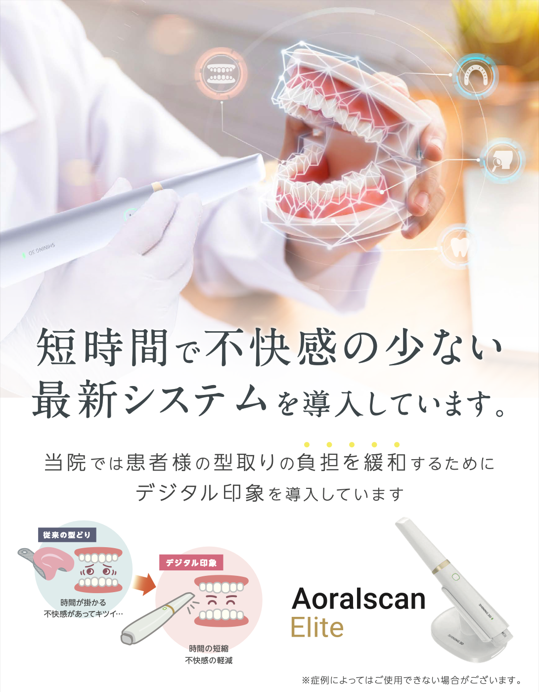 | 治療の流れ | 石膏模型を作製し技工所に送付するため時間がかかる | データを即時送信でき、治療の進行がスムーズ |
